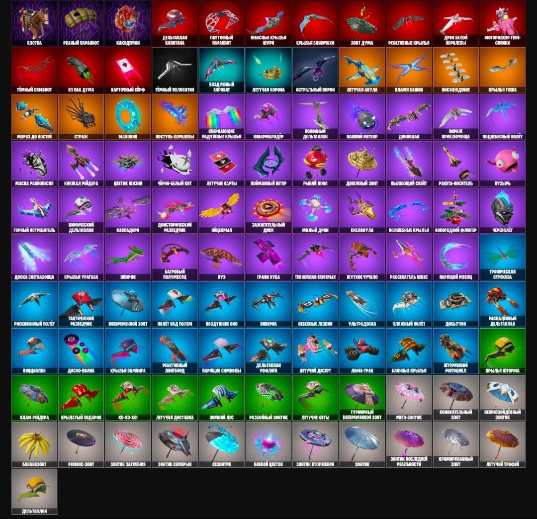 What You Get with 💖 135 skins · 144 choices · 125 dances · 121 hang glider: