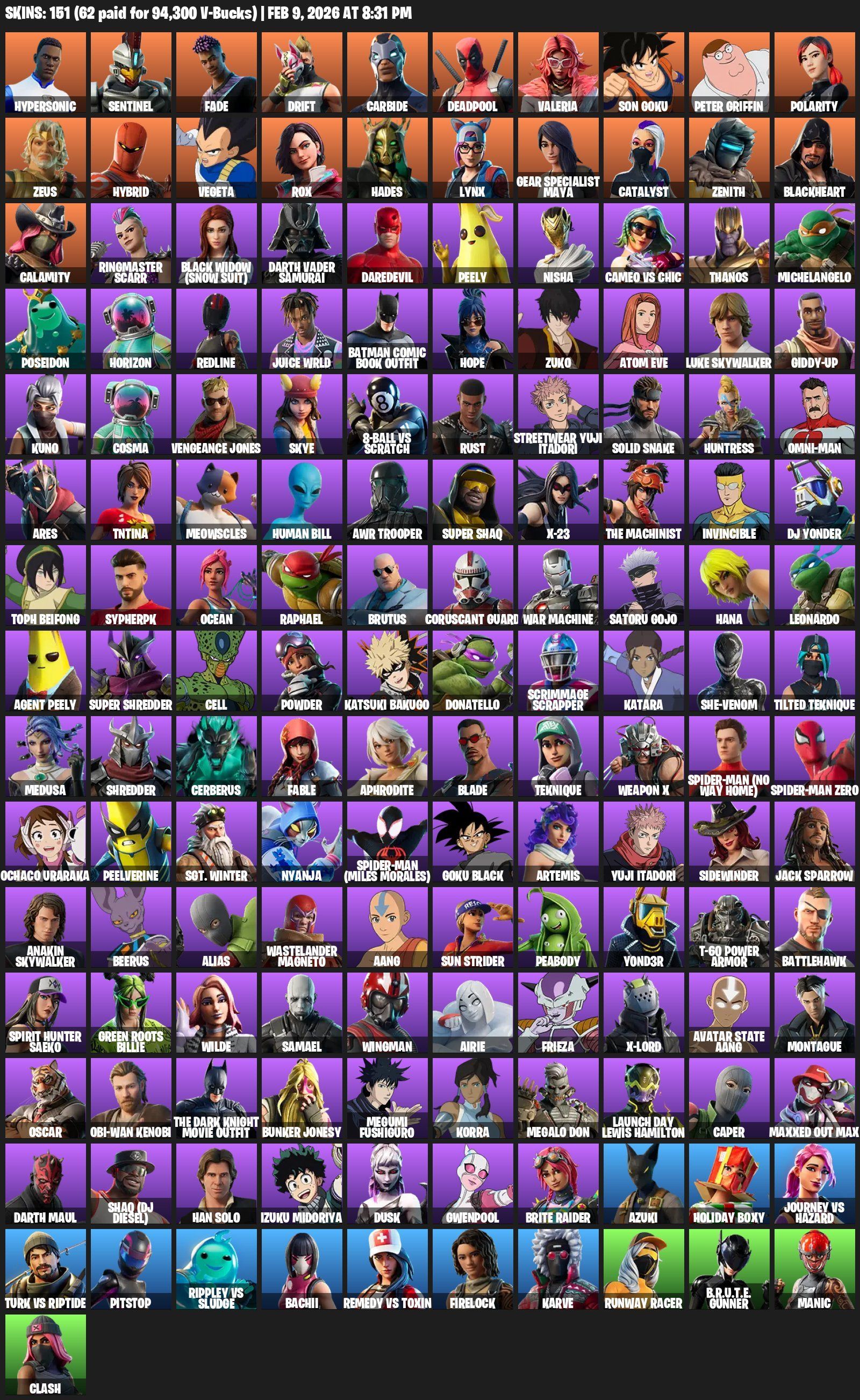 This account features 151 unique skins, including Solid Snake, Oscar, and Yuji Itadori. Players will gain access to a wide variety of cosmetics, along with 1500 V-Bucks to enhance gameplay. A fully ready account, packed with customization options and unlocked characters. A great choice for those looking to enjoy Fortnite and use diverse skins in the game.
