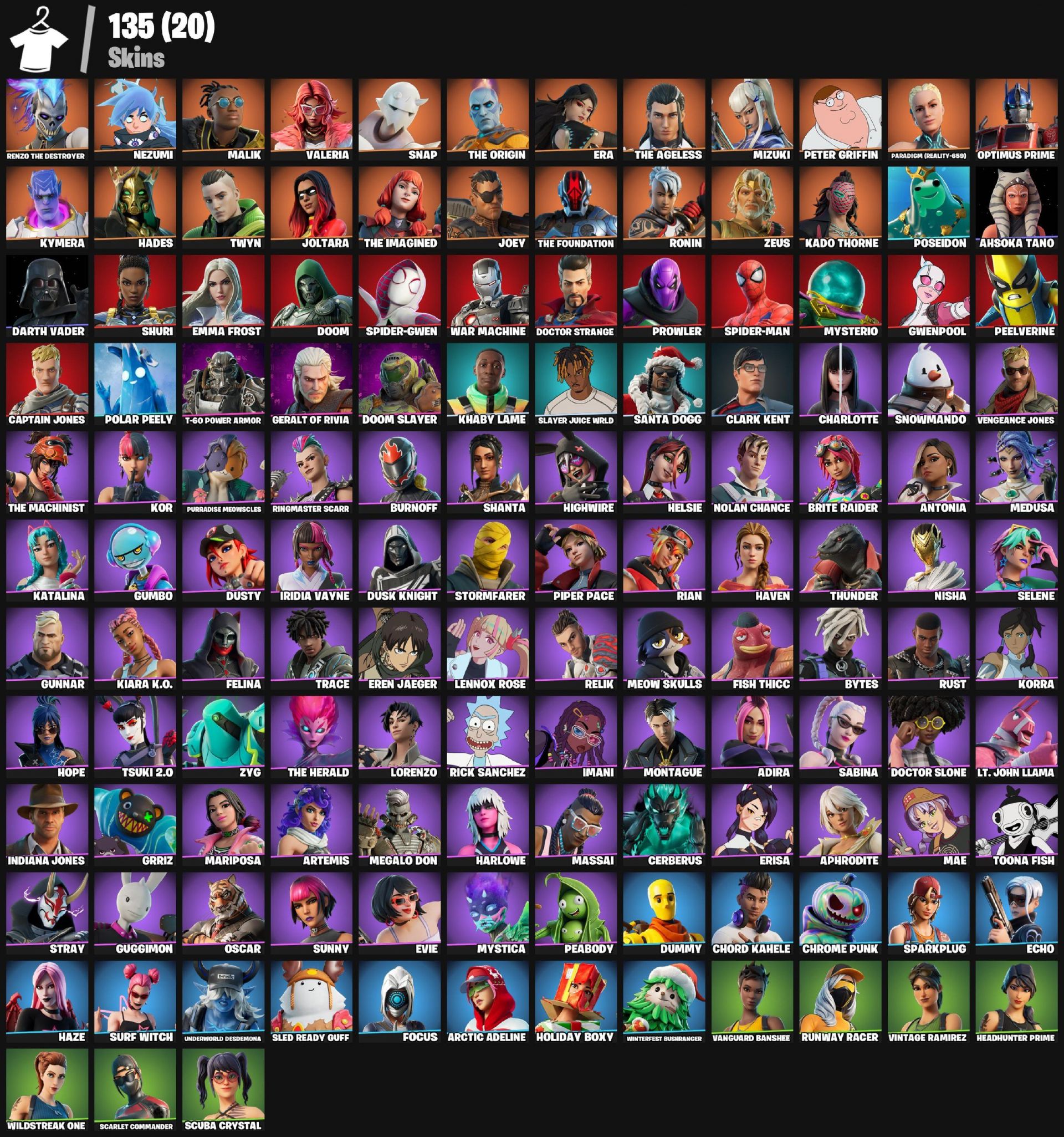 Цей акаунт містить 135 унікальних скінів, включаючи Renzo the Destroyer, Nezumi, Malik, Valeria, Snap, The Origin та Era. Ідеально підходить для гри та колекціонування, доступний на всіх платформах. Є можливість користуватися рідкісними предметами та емоціями. Повний доступ з можливістю ігрової кастомізації та покращення вигляду персонажа. Відгуки підтверджують якість акаунта, що робить його чудовим вибором для занурення у світ Fortnite.