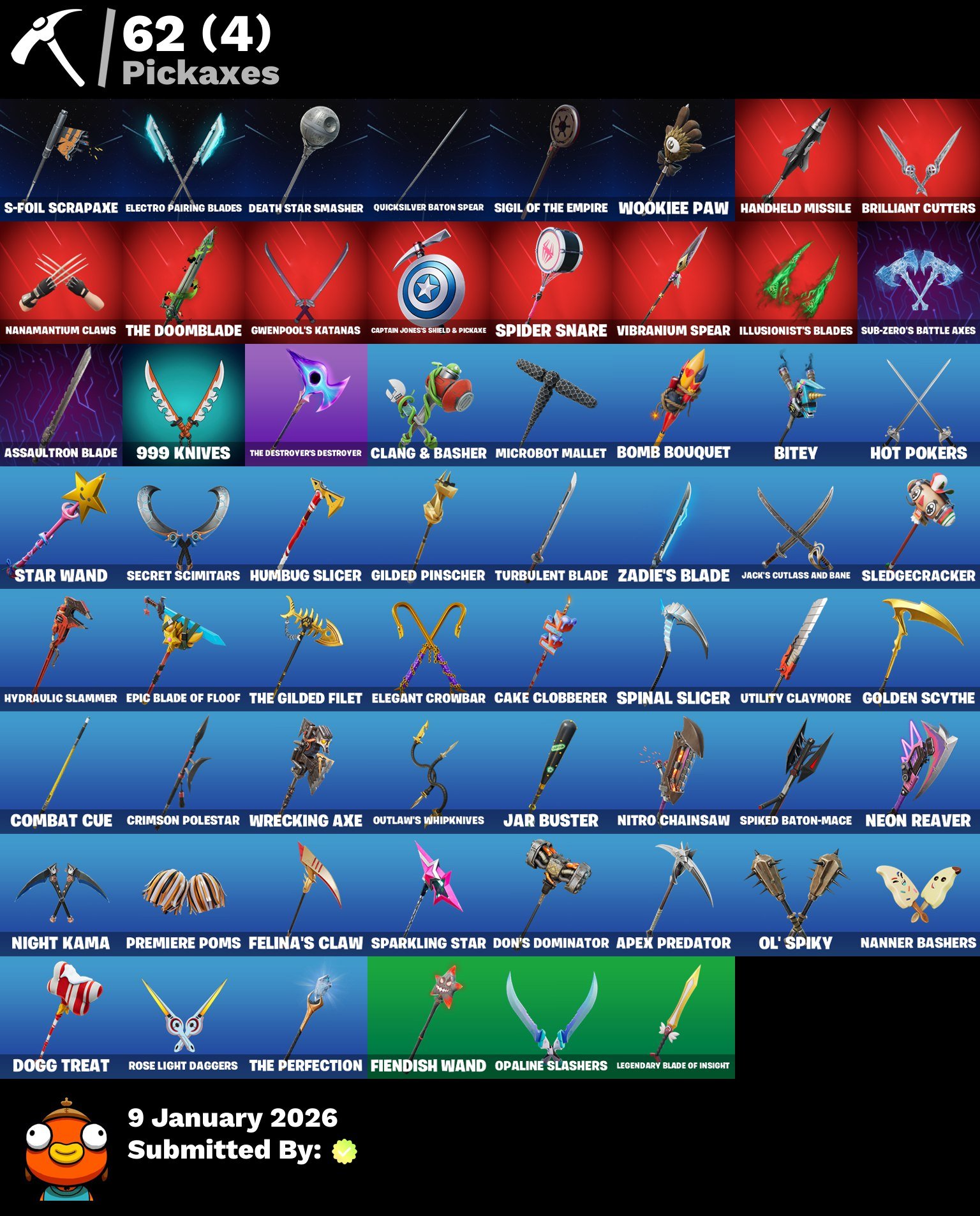 Цей акаунт містить 32 унікальних скіна, включаючи Captain Jones, Gwenpool, Peelverine, Emma Frost, Mysterio та Doom. Гравці неодмінно оцінять різноманітність косметики, доступної на цьому акаунті. Повністю готовий до гри з безліччю розблокованих аксесуарів, включаючи 82 рюкзака та 62 сокири. Цей акаунт підходить для тих, хто хоче швидко зануритися у світ Fortnite з багатою колекцією унікальних образів та предметів.