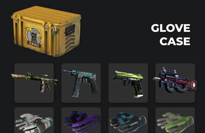 Glove Case to oryginał — pierwsza skrzynka w historii Counter-Strike, która wprowadziła rękawice. Zawiera pełną kolekcję rękawic, w której znajdują się jedne z najdroższych przedmiotów kosmetycznych w grze.